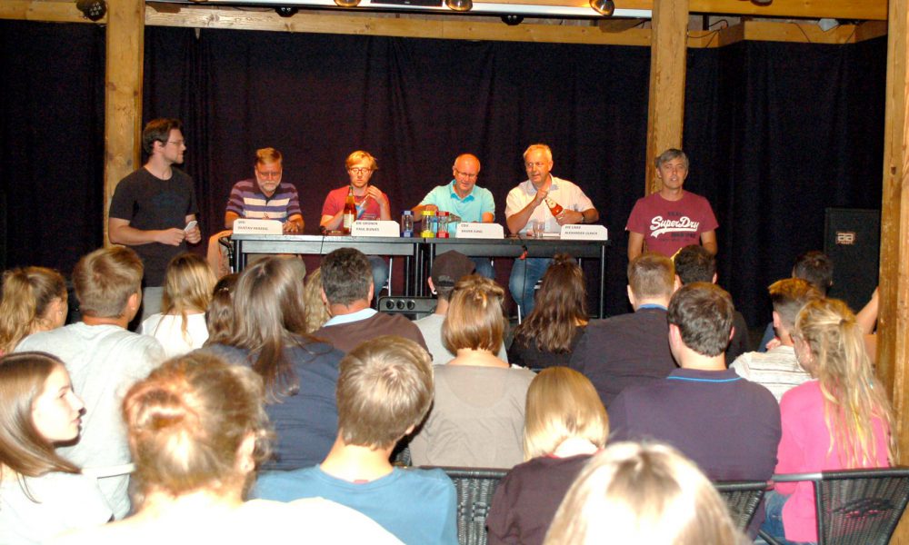 Den Fragen der Moderatoren und der jungen Menschen stellten sich die Wahlkreiskandidaten der aktuell im Bundestag vertretenen Parteien, Gustav Herzog, Xaver Jung, Alexander Ulrich und Paul Bunjes.